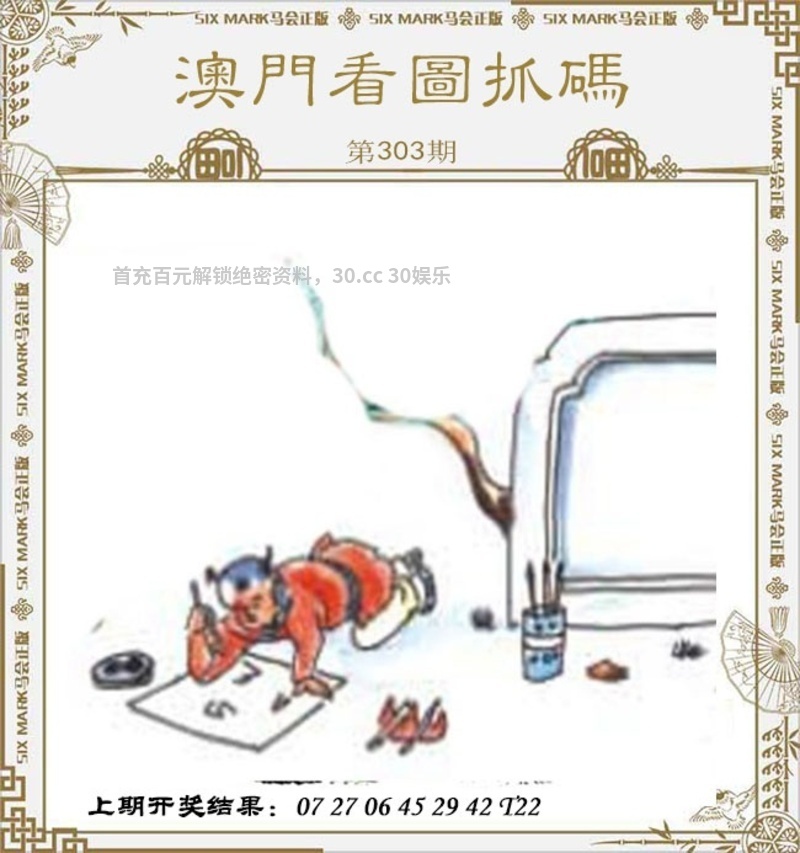 【妙解看图抓码】303期:图中有一个孩子正在地上用毛笔练习写字,他正在写数字5和7,他身旁有一个装有毛笔的笔筒和一个砚台。