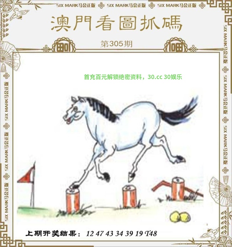 【妙解看图抓码】305期:图中头一匹白马正在跳过两个易拉罐形状的障碍物,马的前方,地面上有一个插着红旗的标志。